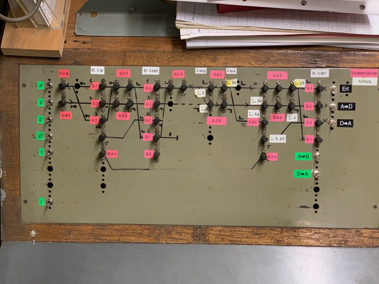 Moin, Andreas und ich haben die Planstörungen erfolgreich einbauen können. Es stehen schaltbare Störungen im Bahnhofsblock Adorf sowie Streckenblockstörungen zwischen Adorf und Bheim und Adorf und Dbach zur Auswahl. Die Störungen werden jeweils mit einem Kippschalter aktiviert (die Regel-Funktion wird unterbunden). Die Grundstellung für die Kippschalter ist nach unten, dann ist die Störung nicht aktiv und die Regelfunktion aktiv. Durch Aktivierung der Störung wird der Blockstrom unterbrochen, und die Blockfelder laufen nicht um. Links können der Blockstrom der Befehlsfelder von Adorf unterbrochen werden (schwarz auf grün): p4: Ausfahrt p4 nach Bheim a3: Einfahrt von Bheim nach Gleis 3 a2: Einfahrt von Bheim nach Gleis 2 p2D: Ausfahrt nach Dbach b: Einfahrt von Dbach nach Gleis 2 a: Fahrstraßenfestlegung a Rechts oben ist der Streckenblock zwischen Adorf und Dbach (weiß auf schwarz): Erlaubniswechsel Streckenblock Adorf nach Dbach Streckenblock Dbach nach Adorf Rechts unten ist der Streckenblock zwsichen Adorf und Bheim (schwarz auf Grün): Streckenblock Adorf nach Bheim Streckenblock Bheim nach Adorf Gruß, Stefan -- Stefan Bethke <stb@lassitu.de> Fon +49 151 14070811